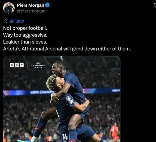这位曾因为采访C罗炮轰曼联而名声鹊起的主持人在社媒嘲讽道:“这根本不是真正的足球。踢得太激进,防线漏得像筛子一样。阿尔特塔那支追求消耗的阿森纳,足以在决赛中拖垮他们中的任何一个。”