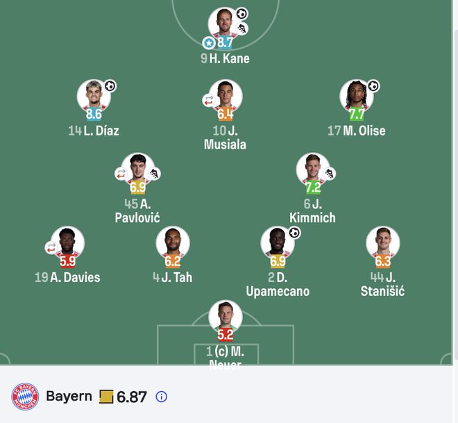 第69分钟,拜仁靠的中场位置凯恩送出过顶长传,禁区内迪亚斯很出色停摆脱,然后爆射比分来到了4-5。