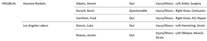 北京时间4月18日,NBA官方公布了火箭vs湖人首战的伤情报告,火箭一方,范弗利特(右膝前交叉韧带手术康复)、亚当斯(左脚踝手术康复)缺阵,杜兰特(右膝挫伤)被列为出战成疑。湖人一方,东契奇(左腿筋拉伤)、里夫斯(左侧腹斜肌拉伤)缺阵。双方的首场比赛,将在4月19日上午8点30分进行。