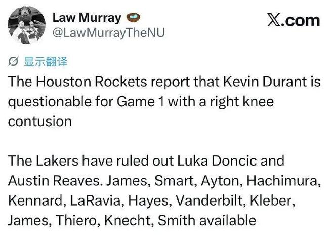 火箭全员齐整,湖人那边东契奇&里夫斯均因伤归期未定,外界普遍认为火箭可以笑到最后。