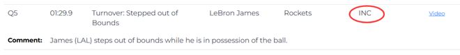 第二次漏判发生在距离加时赛结束还有1分29秒。裁判报告指出,詹姆斯在与火箭球员拼抢时拿到球,但这时他的脚已经出界,裁判没有响哨。虽然这一球理论上是湖人获利,但詹姆斯救球回来,火箭又得到球权。这一漏判的影响,对比赛来说没有上一次那么明显。