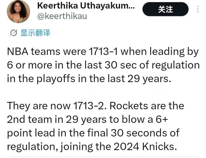 季后赛这种情况下输球有多离谱?ESPN数据显示,过去29年季后赛,常规时间最后30秒领先至少6分的球队,战绩为1713胜1负,胜率高达99.94%,而本场过后,这一纪录更新为:1713胜2负。火箭成为第二个耻辱的失利者,而第一个是2024年的尼克斯。
