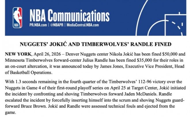 北京时间4月27日,NBA官方公布对于首轮G4掘金与森林狼冲突的处罚结果,约基奇被罚款5万美元,兰德尔被罚款3.5万美元,而麦克丹尼尔斯没有被处罚,双方没有球员被禁赛成为万幸之事。