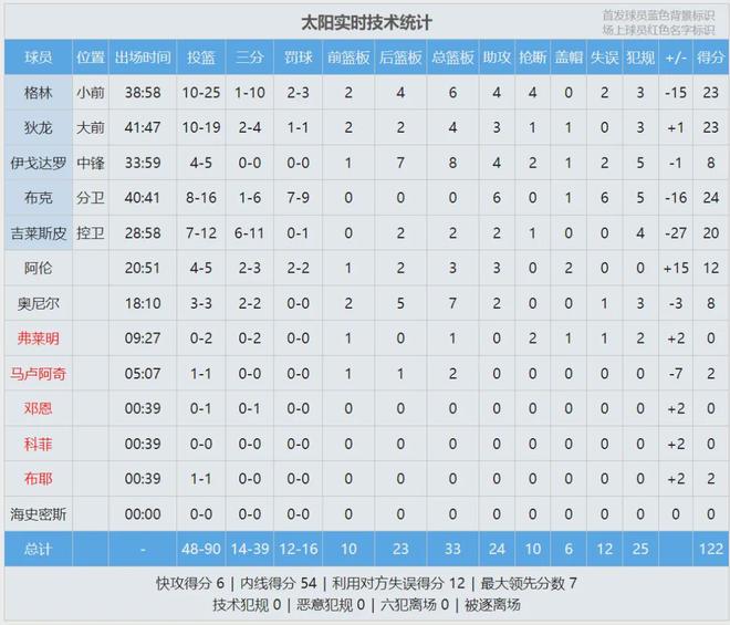 太阳球员狄龙-布鲁克斯此役出战42分钟,投篮19中10,三分4中2,罚球1中1,得到23分4篮板3助攻1抢断1盖帽。亚历山大赛后说道:“狄龙是个极具竞争心态的球员,这轮系列赛打得非常出色。但我们晋级了,所以一切都很完美。”