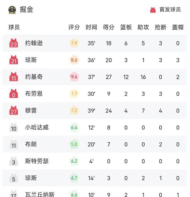此役能够力挽狂澜,约基奇无疑是无可争议的定海神针——这位两届MVP得主交出一份教科书级的领袖答卷,用现象级三双表现扛起整支球队前行。