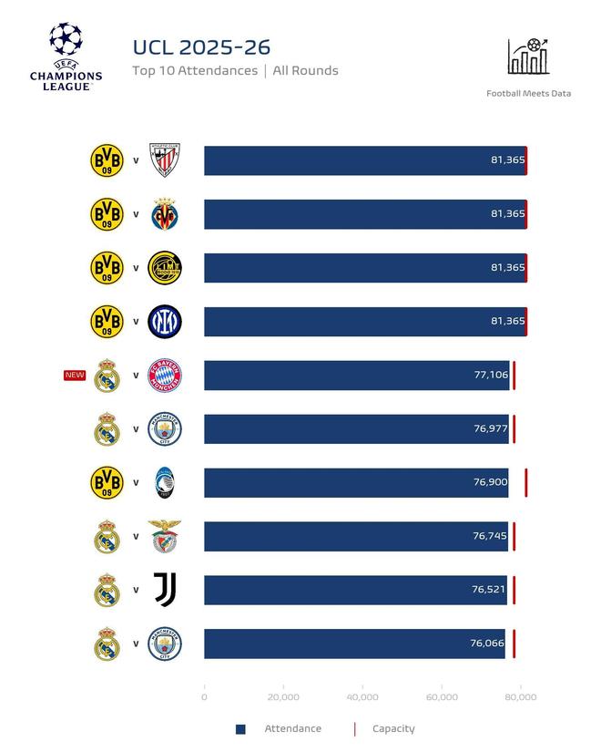4月9日,数据平台Football Meets Data整理了本赛季欧冠上座人数榜单,其中,多特蒙德包揽前4并且在上座总人数前10中占据5席,剩余5席被皇家马德里包揽,其中皇马vs拜仁的欧洲德比位列榜单第5。