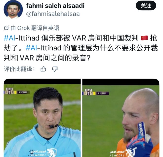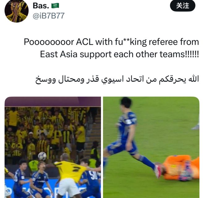 “中国裁判需要被禁止执法,他们没有资格执法任何亚洲顶级赛事!”;“应该禁止东亚裁判执法亚冠,他们嫉妒沙特联赛球队的强大,因为总是抢走他们的分数!”;“受贿且腐败的亚足联!”