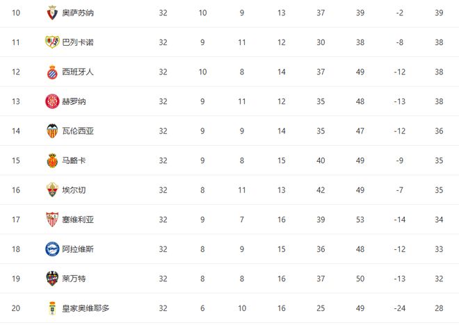 但更夸张的,还不是塞维利亚的崩盘,而是整个西甲保级格局的“全面混战”。从积分榜第10的奥萨苏纳开始,到垫底的奥维耶多,整整11支球队全部被卷入保级漩涡。奥萨苏纳目前也只领先降级区6分,看似安全,实际上只要连续两轮失手,就可能被拖下水。