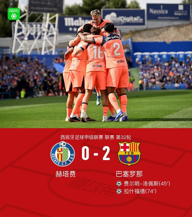 北京时间4月25日22:15,西甲第32轮继续进行,巴塞罗那做客阿方索-佩雷斯球场挑战赫塔费,本场主裁判为弗朗西斯科-埃尔南德斯。比赛中,佩德里手术刀直塞助攻费尔明破门,莱万助攻拉什福德单刀再下一城。最终,巴萨2-0客胜赫塔费,以11分优势领跑西甲。
