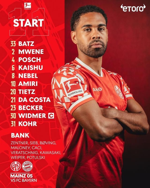 美因茨首发:33-巴茨、4-波施、31-多米尼克-科尔、30-威德默、21-达科斯塔、2-姆韦内、8-内贝尔、6-佐耶海舟、10-阿米里、23-贝克尔、20-蒂茨