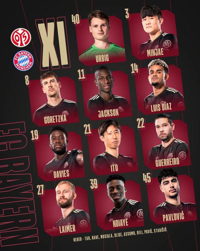 北京时间4月25日21:30,德甲第31轮,拜仁客战美因茨。赛前首发公布。