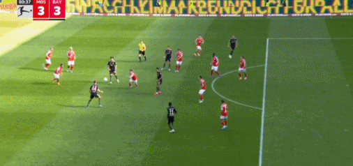 第80分钟,穆西亚拉门前包抄破门,拜仁连追3球3-3美因茨!