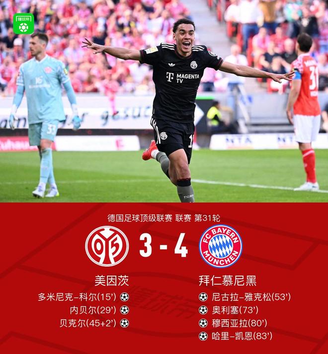 北京时间4月25日德国足球顶级联赛 联赛 第31轮,美因茨主场对阵拜仁慕尼黑。上半场佐耶海舟传中,科尔凌空抽射破门,之后格雷罗中场丢球,之后的进攻内贝尔补射破门,半场补时阶段贝克尔补射破门继续扩大比分。下半场默尔传中,雅克松凌空抽射破门扳回一球,之后奥利塞内切圆月弯刀再追一球,随后穆西亚拉门前包抄破门扳平比分,紧接着穆西亚拉传中被扑,凯恩补射破门反超比分。最终拜仁让三追四4-3战胜美因茨。