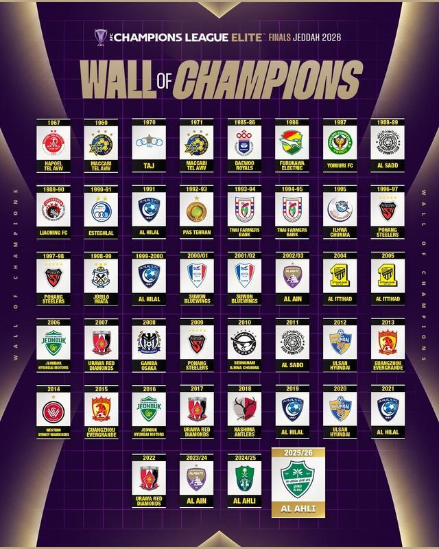 北京时间4月26日的亚冠精英联赛决赛中,吉达国民1-0战胜町田泽维亚实现亚冠两连冠。赛后,亚足联官方也更新了亚冠精英联赛历届夺冠榜单(包含前身亚洲冠军俱乐部锦标赛时期)。其中,沙特球队利雅得新月共计4次夺冠,为历史第一。在俱乐部国家夺冠次数榜单上,韩国俱乐部共12次夺冠,为历史最多。