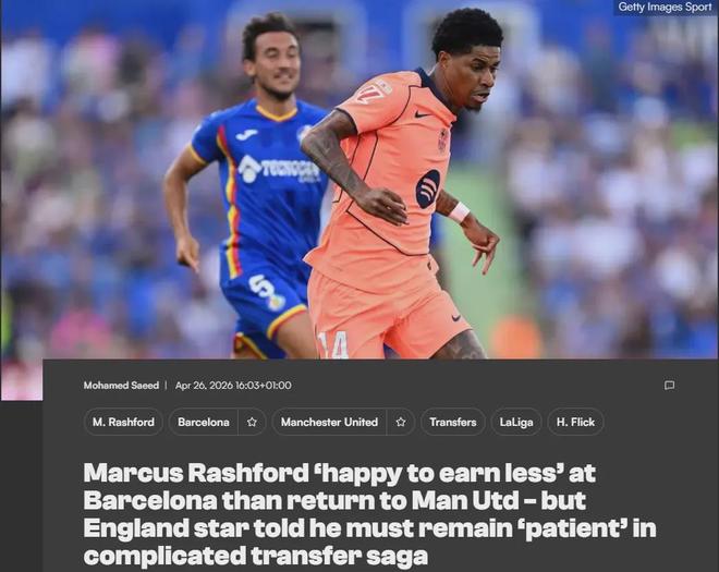BBC记者巴拉格在自己的专栏中表示,拉什福德宁愿拿更低的工资留在巴萨,也不想重返曼联,但红蓝军团依然需要决定是否能承担得起买断这名前锋的总费用,他们的财政十分拮据。