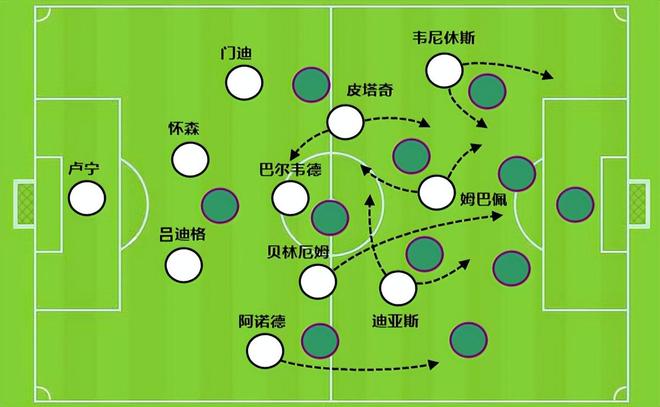 在反击中,姆巴佩自己往往不跑在最前端,他会停留在前腰位置接应,同时又不愿意给韦尼休斯送出可能出现单刀的妙传。