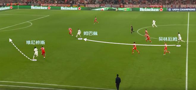 姆巴佩则相反,他需要的是锋线队友来给他传球,所以韦尼休斯不得不远离球门,通过更多的强突来吸引防守注意力,给弧顶的空位姆巴佩“喂饼”。
