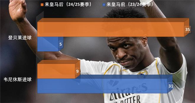 同样的,在姆巴佩来皇马前,韦尼休斯一个赛季打入35球,上赛季成为姆巴佩队友后,韦尼休斯进球数暴跌到9个。