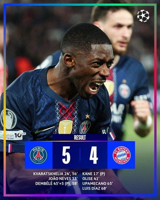 欧冠半决赛首回合,巴黎圣日耳曼主场5-4战胜拜仁慕尼黑,双方贡献了一场极其精彩的比赛球。此役,两支球队也创下了多项神迹。